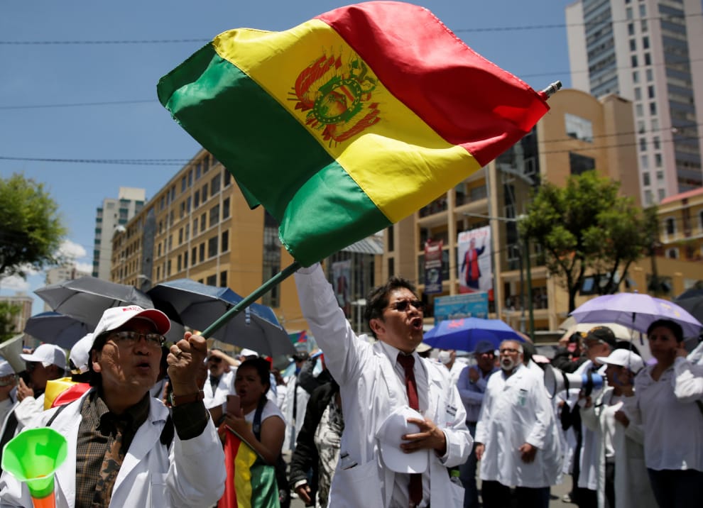 在首都拉巴斯(La Paz)的國家選舉計票中心前,民眾高舉玻利維亞國旗示威,抗議中選會計票不公、黑箱作業,意圖讓現任總統莫拉萊斯(Evo Morales)繼續連任。