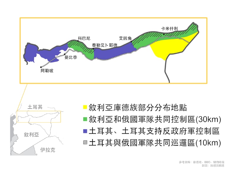 23號,現在與庫德族合作、支持敘利亞政府的俄國也和土耳其政府達成協議,將「協助」庫德族的軍事組織人民保護部隊(YPG)從敘利亞—土耳其邊界撤離 30公里,並在特定地區劃定 10公里寬的「安全區」、由土耳其、俄國兩國軍隊共同巡邏。