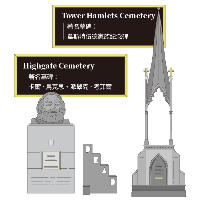 維多利亞時代之前,英國沒有大型的墓園,人死後通常依習俗葬在教堂四周(因此幾乎所有歷史悠久的教堂都被墓碑圍繞),這在人口不多的鄉間不是問題,然而在倫敦這樣一個人口密集的大城市裡,為數不多、佔地不大的教堂墓園很快就不敷使用,加上教堂是人們生活的中心,土壤裡的屍體容易造成飲水污染和疾病傳播,因此國會修法准許民間公司在倫敦城外購買土地,前後設立七大墓園,俗稱「豪華七墓」(Magnificent Seven) – Highgate Cemetery和Tower Hamlets Cemetery就是其中之二。