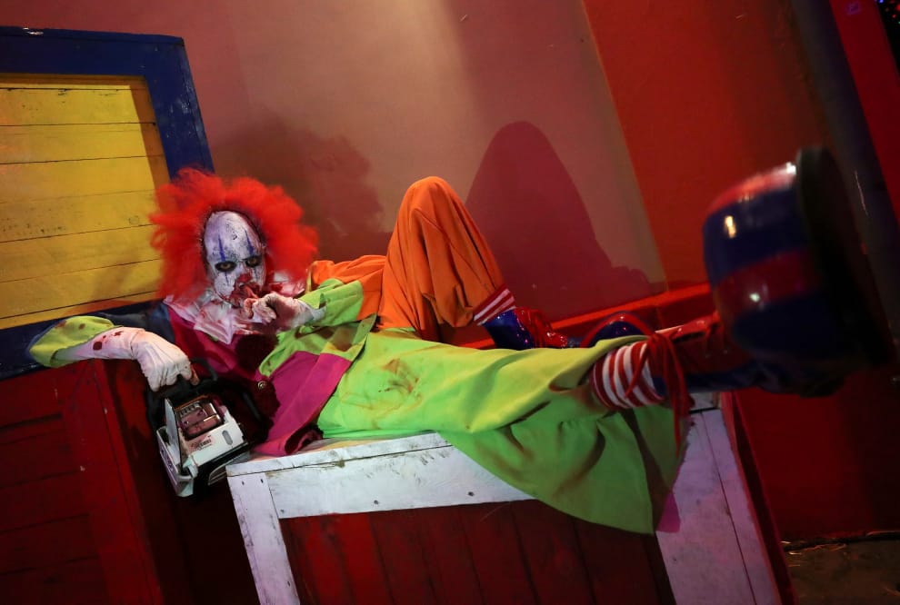 在比利時中部的瓦夫爾(Wavre),一名男子穿上小丑服參加當地遊樂園舉辦的萬聖節遊行。