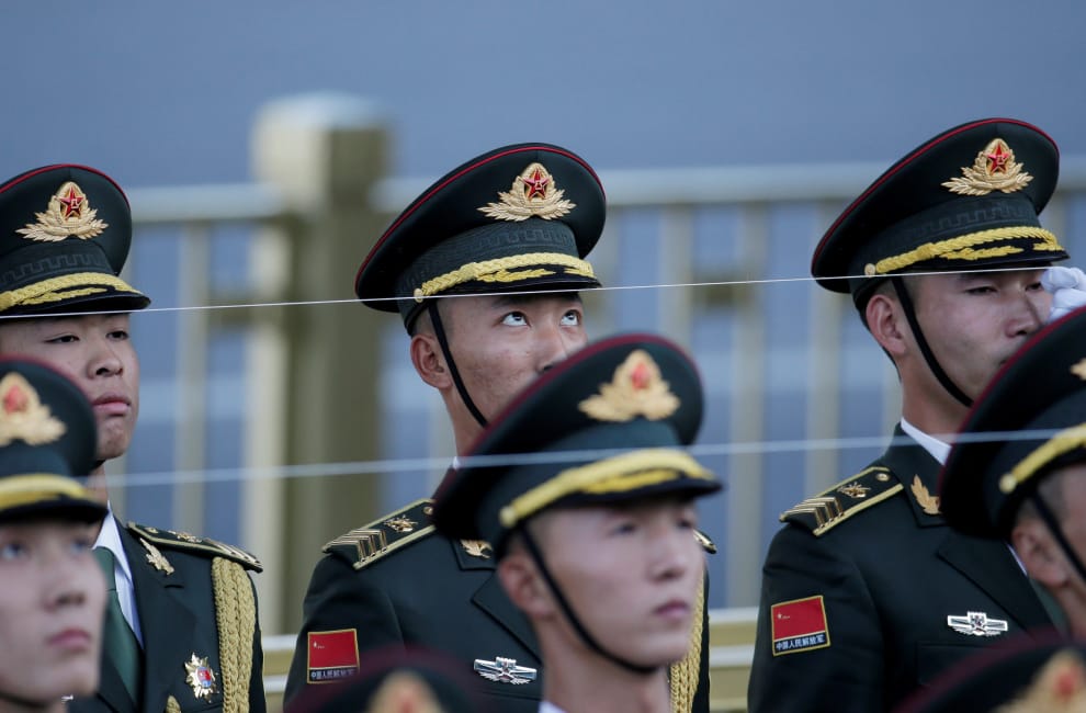 為了準備在北京人民大會堂舉辦的歡迎典禮,中國軍人利用校準線來確認隊伍的整齊。