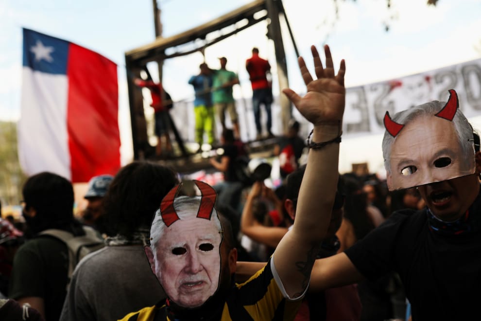 在首都聖地亞哥街頭,抗議民眾手持國旗、戴上智利總統皮涅拉(Sebastián Piñera)長了惡魔角的面具示威。