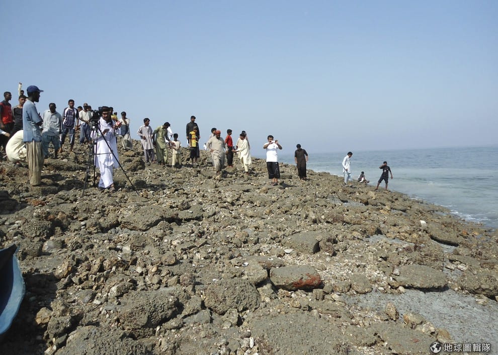 路透社上圖為民眾在巴基斯坦的新小島上探勘。
