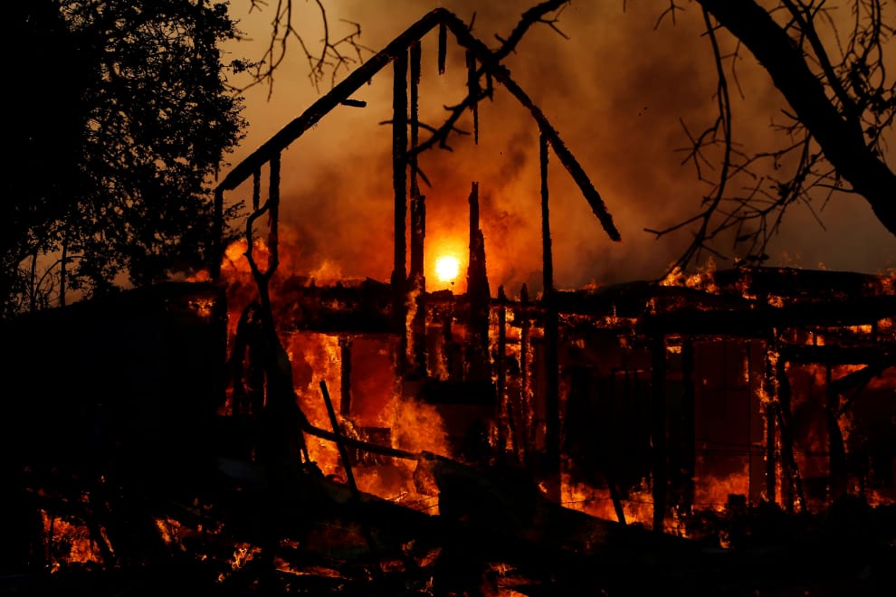 太陽剛好落在持續延燒的「金凱德野火」(Kincade Fire)之間,這起大火因為強勁的風勢助長,已經延伸約 1萬公頃。