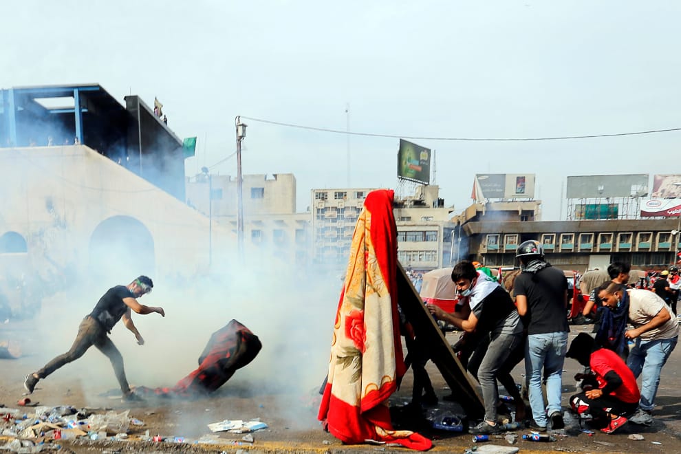 伊拉克人走上街頭,對政府貪腐、缺乏工作機會、糟糕的公共服務等議題表達不滿。畫面中只見他們用棉被、木板架起了抵禦鎮暴警察的障礙物。