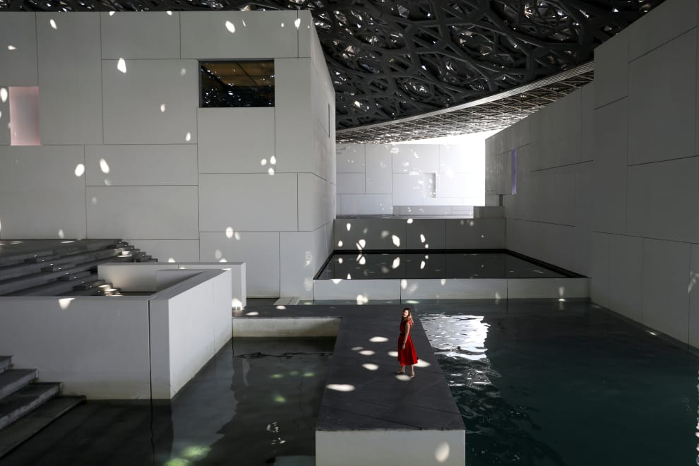 一名遊客來到阿布達比羅浮宮(Louvre Abu Dhabi Museum),走在天頂是由幾何格線設計出來的空間裡。