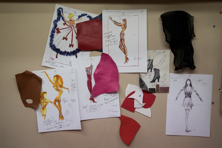 每一次當台上的舞者表演完回到後台,所有的情景又會再重複一遍:一群舞者衝回後台,一群宛如軍隊的助理把五顏六色的服裝照順序攤開好,許多服裝上都鑲嵌了亮眼的水鑽,一排又一排的粉紅羽毛圍巾則垂掛在桿子上;在架子上則整齊地掛著粉紅色和黑色的過膝皮靴,這樣的設計讓舞者可以快速找到自己需要的裝扮,當他們在換裝時,技師就能快速替下一首歌換幕。