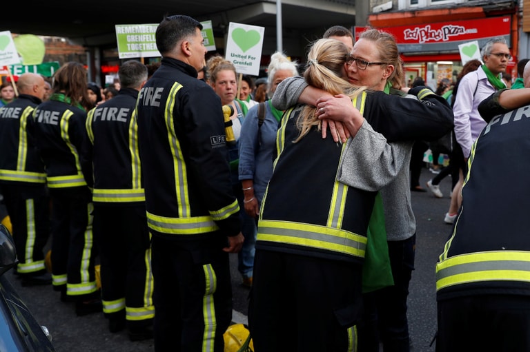 一旦易燃建材碰到火,消防人員要在第一時間趕到現場、撲滅火勢並不如想像中容易。對此,摩爾-比克爵士稱讚大火當晚衝進現場的消防員有「無上的勇氣」,有的消防員爬進正在燃燒的格蘭菲塔中幫助住戶逃命。