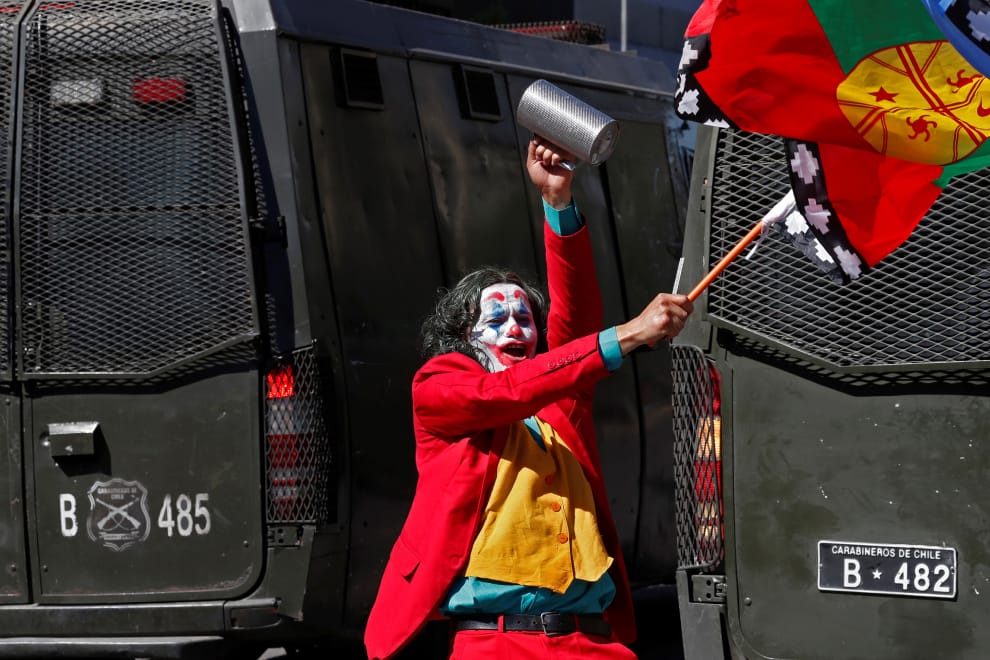 30號在首都聖地牙哥街頭,一名示威者打扮成電影《小丑》的角色抗議。