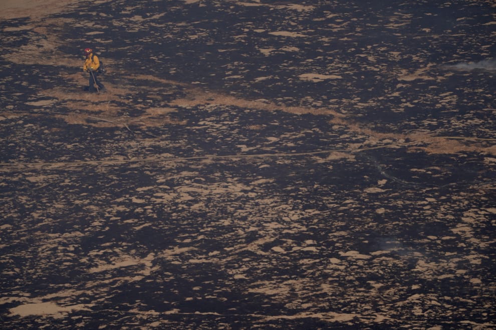 消防人員在撲滅森林野火德克斯特山火(Dexter Fire)後,行走在一片焦黑的草地上。