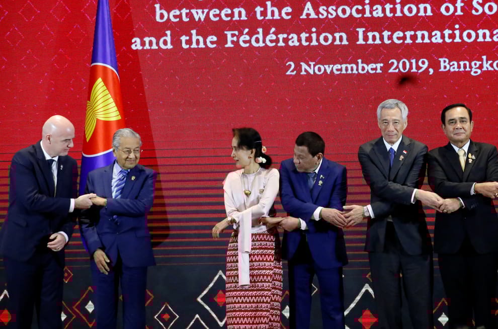 東南亞國家協會(ASEAN)的成員國與國際足球總會主席因凡蒂諾(Gianni Infantino,左一)簽署瞭解備忘錄(Memorandum of understanding)後,和各國領導人手牽著手一起合照。