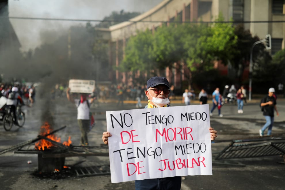 在首都聖地亞哥街頭,一名示威民眾舉著寫有「我不怕死,但我怕退休」字樣的海報,抗議低薪、缺乏健康照護以及退休金微薄的社會環境。