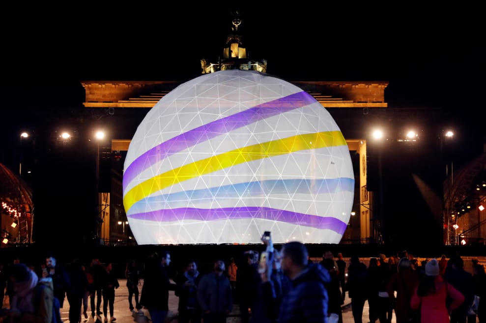 在柏林著名地標布蘭登堡城門前,可以看到名為「動態視覺」的燈光藝術裝置,準備迎接柏林圍牆倒塌 30周年紀念。