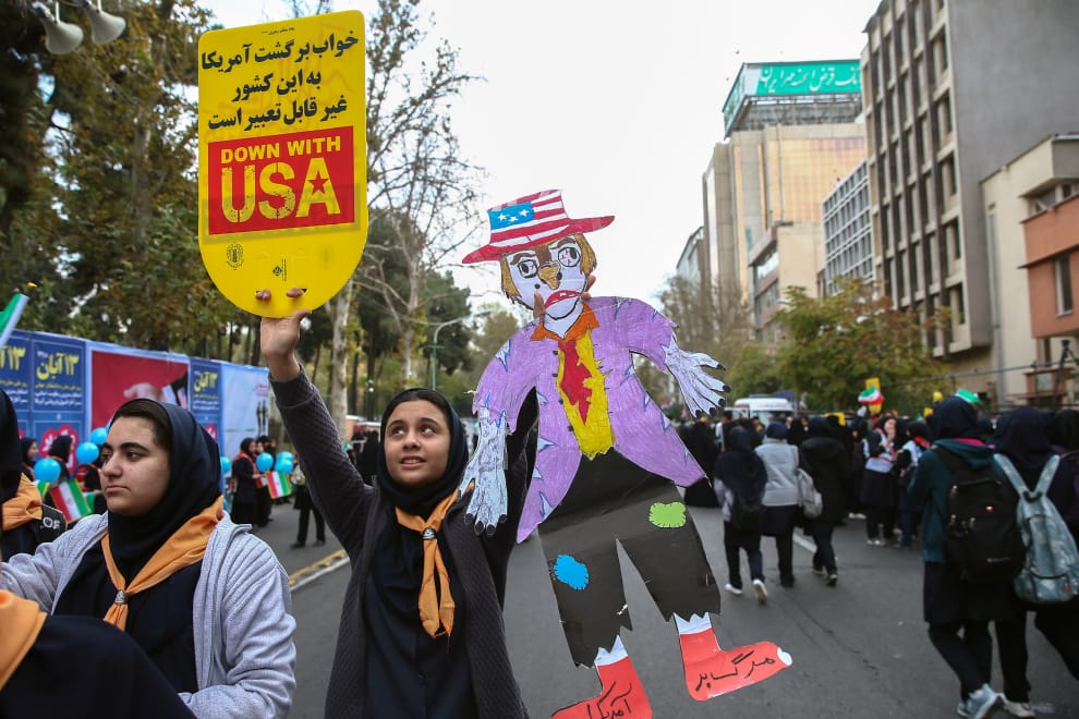 在首都德黑蘭的美國使館舊址,伊朗學生們參加了一場反美抗議,紀念 40年前發生的伊朗人質事件。1979年伊朗爆發伊斯蘭革命後,美國駐伊朗大使館被民眾佔領,美國外交官和民眾淪為人質,雙方對峙了 444天後才完成談判,所有人質獲釋。
