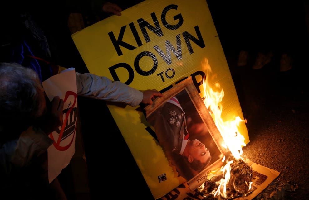 在巴塞隆納的加泰隆尼亞會議中心外,支持加泰隆尼亞獨立的民眾放火燒毀西班牙現任國王菲利普六世(Felipe VI)的照片,迎接前來這裡主持頒獎典禮的國王。