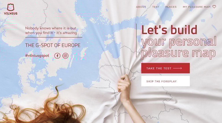 當然,該網站維持同樣的煽情風格,在首頁上邀請民眾完成小測驗,「建立專屬於你的歡愉地圖」,或是「跳過前戲,飽覽維爾紐斯的絕妙風光」。前者讓網站根據測驗結果,為民眾推薦符合他們偏好的觀光行程,後者則讓民眾自行瀏覽網站上的城市景點介紹。