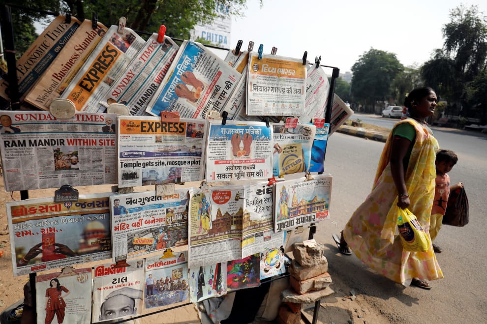 在印度第七大城艾哈邁達巴德(Ahmedabad),一對母子走過書報攤,其上的報紙頭條都在報導印度古城阿約提亞(Ayodhya)聖地之爭。