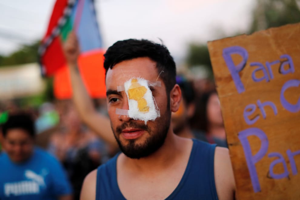 在首都聖地亞哥北方的科利納鎮(La Colina),反政府示威民眾戴上眼罩上街抗議,他們是在模仿日前遭鎮暴警察射傷眼睛的抗議者加蒂卡(Gustavo Gatica)。