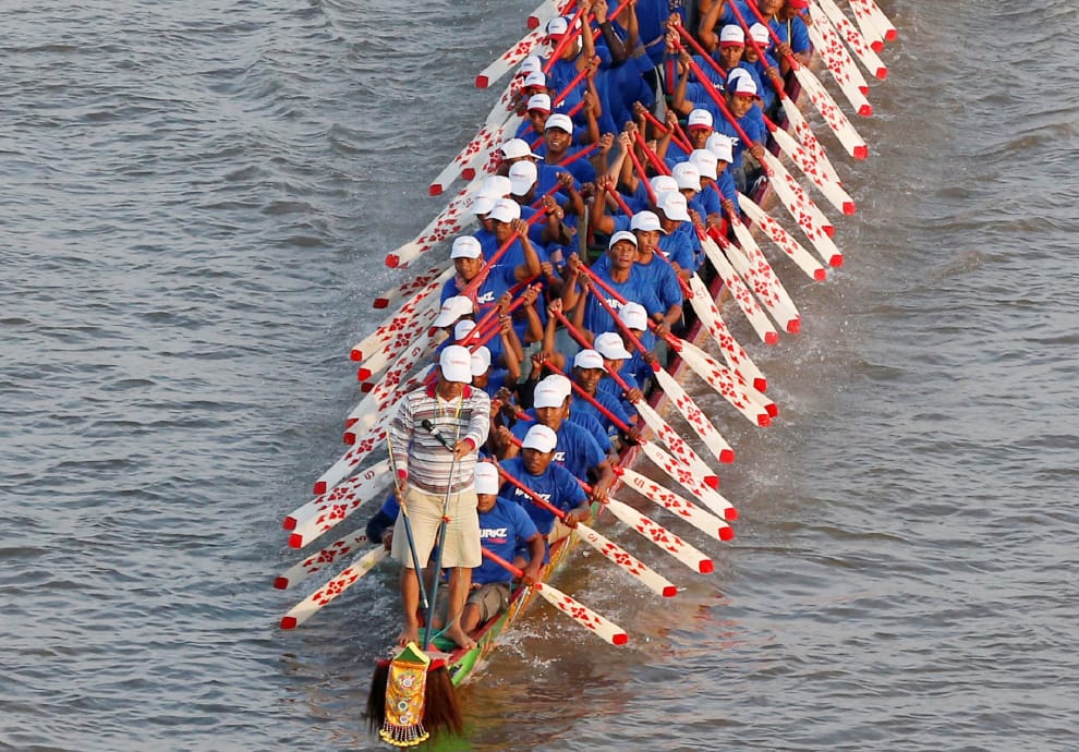 在洞里薩湖,民眾正在歡慶一年一度的送水節,這個節日通常在雨季結束月圓時慶祝,民眾會用划艇比賽來紀念昔日高棉帝國水兵的強大。