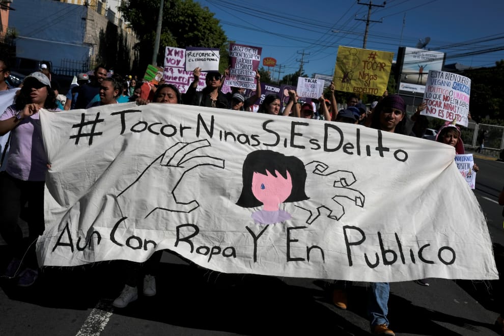 在首都聖薩爾瓦多街頭(San Salvador),人們高舉寫著「觸摸女孩是犯罪」的布條抗議,要求當局將涉嫌性騷擾 10歲女童的法官繩之以法。案發當時,該名法官在住宅區看到被害者一個人在玩耍,隨後便上前觸摸被害者的陰部,被害者的母親發現後一路追到停車場,看著嫌犯開著法院的車揚長而去
