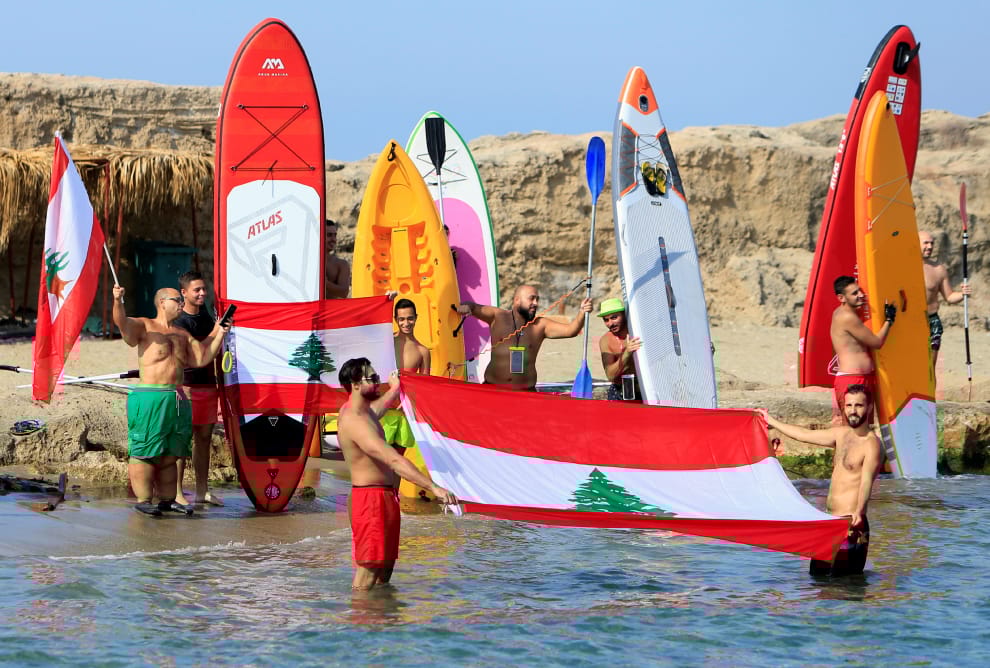 在位於地中海沿岸的賽達市(Sidon),反政府的示威者在沁涼的海水中拿著黎巴嫩國旗抗議政府貪腐、經濟停滯不前、公共服務短缺,並且要求撤換整個政府大改革。