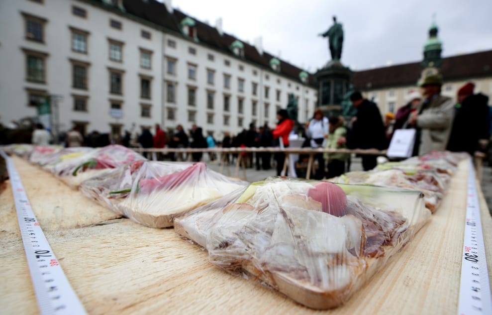 在首都維也納,人們將奧地利的傳統美食「什錦冷盤」(Brettljause)整齊排列在桌上,一旁則放了量尺,他們要挑戰世界最長什錦冷盤的紀錄。