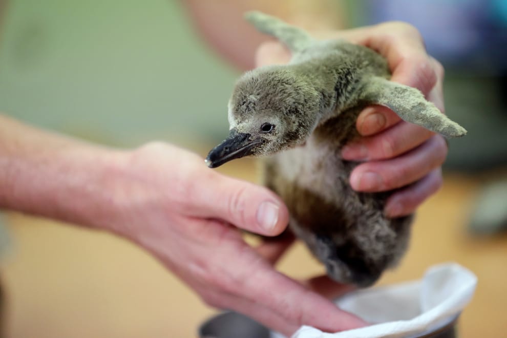 在布拉格動物園內,一名動物園管理員正在幫新生的小企鵝量體重。