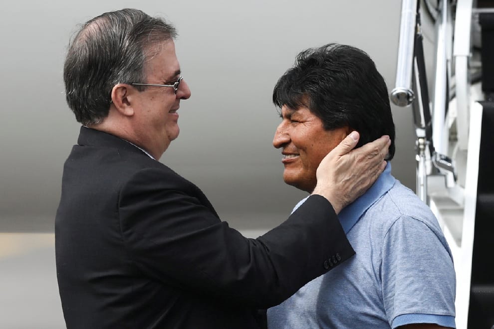12號這天,玻利維亞前總統莫拉萊斯(Evo Morales,右)抵達墨西哥,受到墨西哥外交部長埃夫拉德(Marcelo Ebrard,左)的熱情歡迎。莫拉萊斯除了感謝墨西哥提供他政治庇護,也強調會繼續為玻利維亞人民奮鬥。