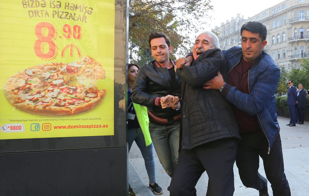 在亞塞拜然的首都巴庫(Baku),兩名便衣警察將參與抗議活動的男子架離現場,這場抗議活動主要是希望當局能開放民眾的集會自由。