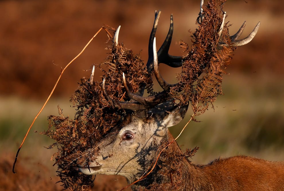 在以充滿野鹿著稱的倫敦里奇蒙公園(Richmond Park),一隻鹿角卡著歐洲蕨(Bracken)的野鹿準備在發情季節和另一隻野鹿較勁搶伴侶。