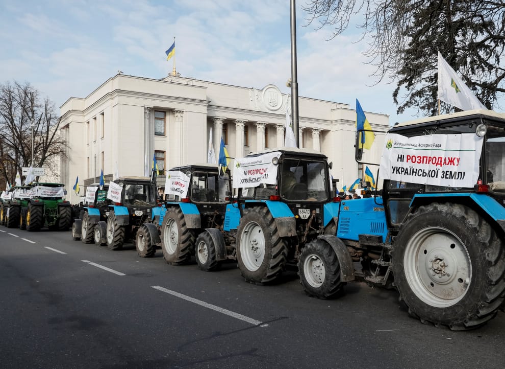 在基輔國會大廈外,農民開出一台台的曳引機抗議國會通過的土地改革法案。這項新法案將從 2020年開放農地和土地市場自由買賣,農民擔心外國投資人會藉此大舉收購農地。