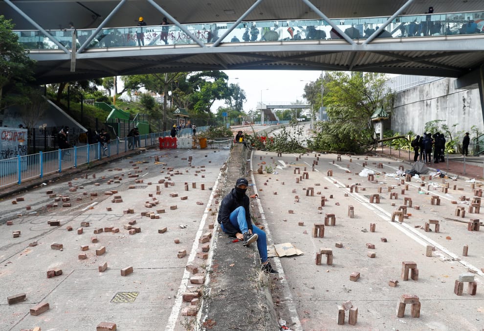 在香港城市大學的宿舍區外,反政府的示威者架好路障和鎮暴警察展開對峙。12號這天,港警圍攻香港城市大學,朝反政府示威者發射催淚彈和橡膠子彈,反政府示威者則退到宿舍區的天橋上,往下投擲磚塊回擊港警。