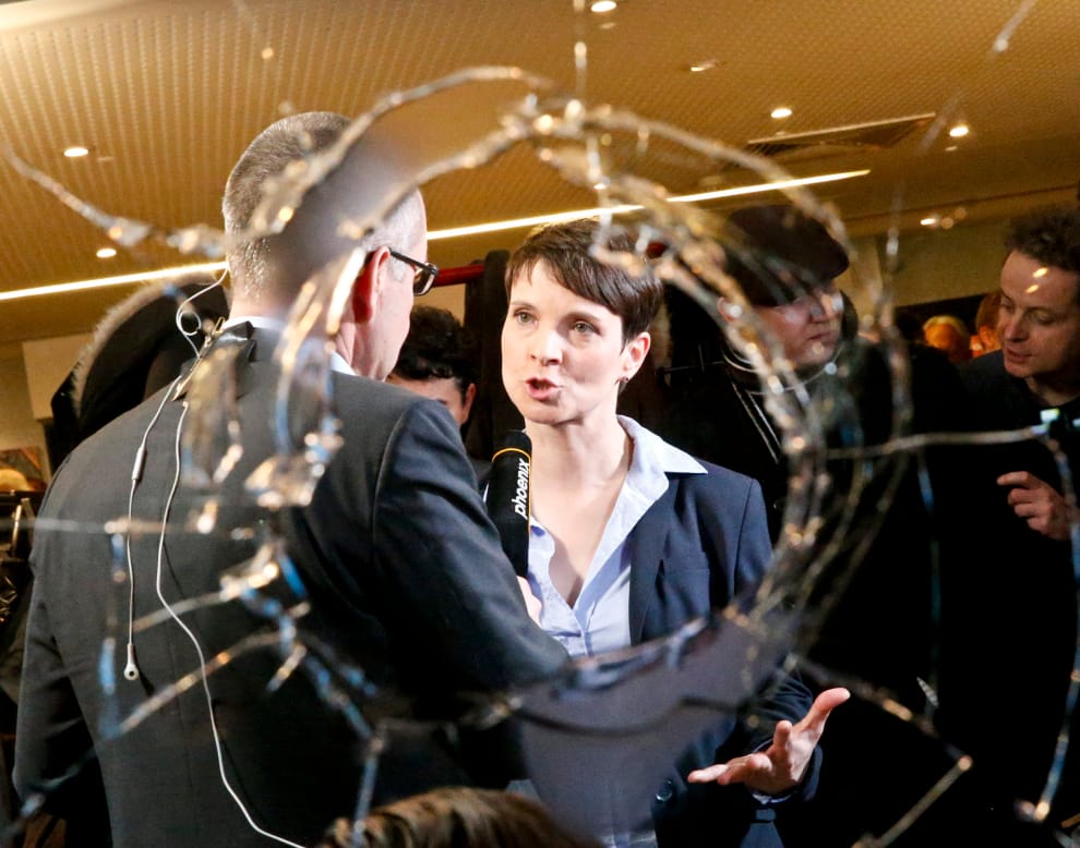 2016年3月,當時的德國極右派「德國另類選擇黨」(AfD)黨主席佩特里(Frauke Petry)在接受媒體採訪。當時在德國國會大選過後,AfD成為國會第三大黨,成為超過半世紀,第一次有公開進入德國國會的民族主義政黨。