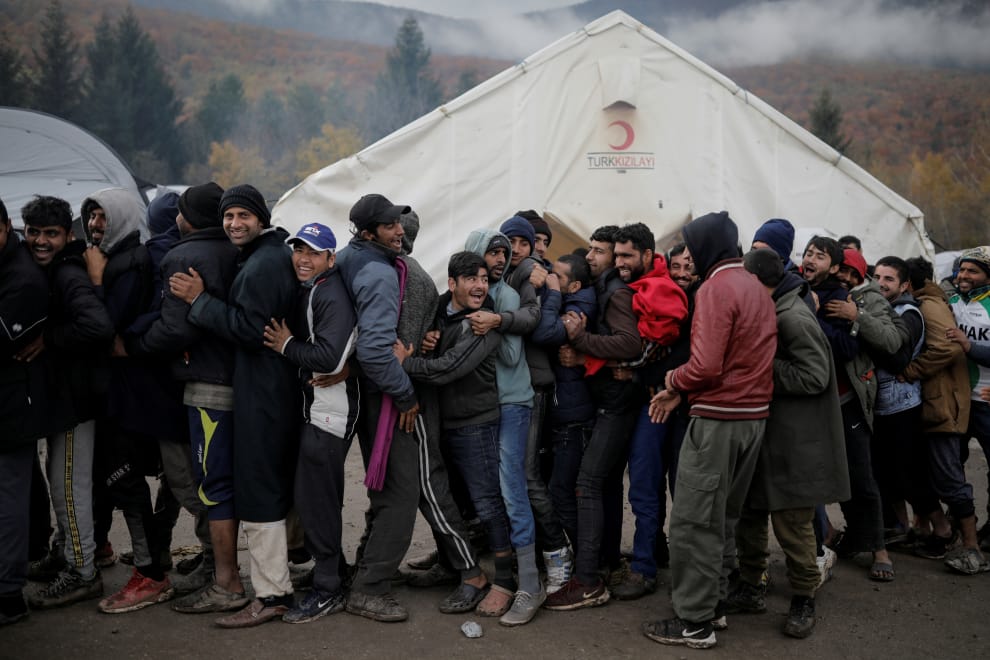 在位於當地西北方的移民營Vucjak,移民們排著隊等待領取食物。