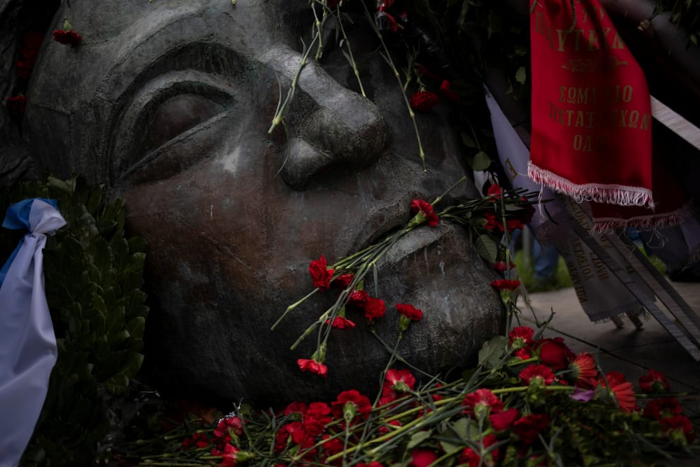 人們在紀念碑上擺上玫瑰與布條,紀念 1973年,遭到血腥鎮壓的雅典理工大學。