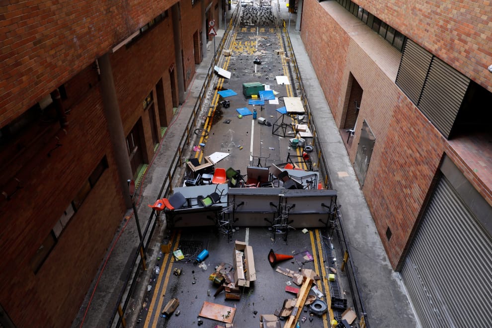 在香港理工大學一角,可以看到反政府示威者用來封鎖道路的路障。