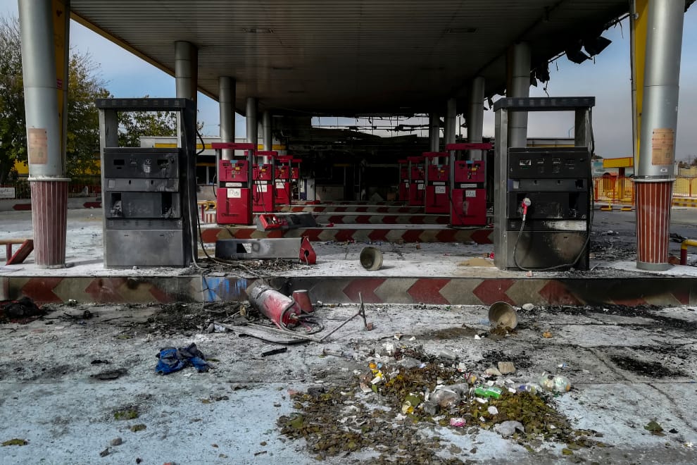 在首都德黑蘭,一間加油站被抗議民眾給焚毀。
