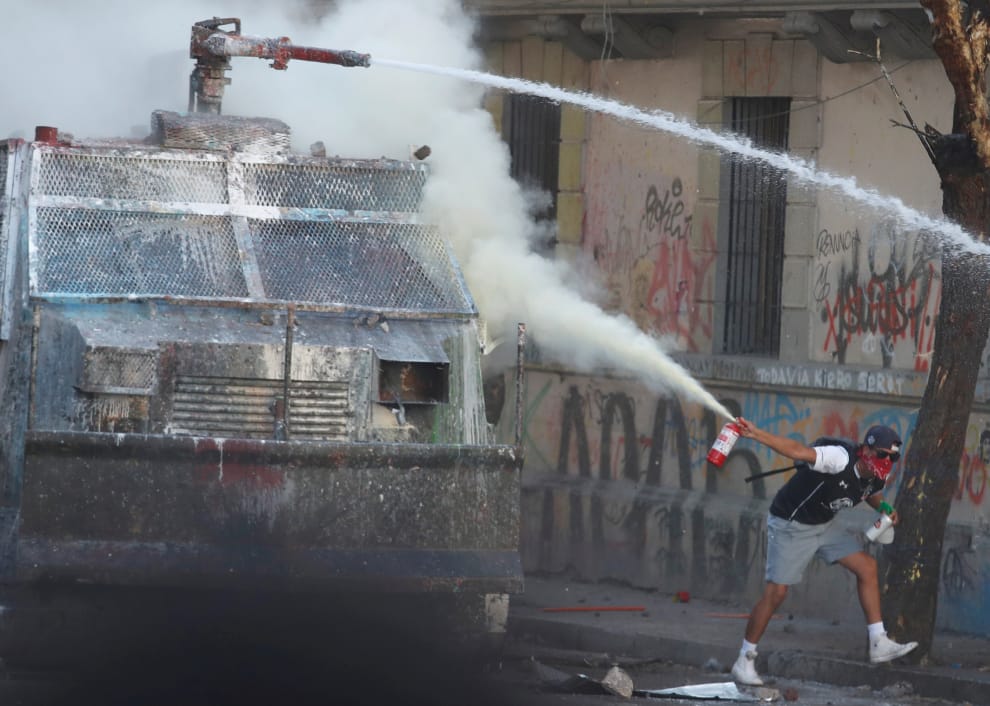 一名示威者一邊朝水炮車的方向噴灑滅火器,希望可以阻擋水炮車行進。在智利已經蔓延好幾周的示威活動,傳出許多在示威過程中受傷的人民,也帶來了鎮暴警察是否執法過當的質疑。