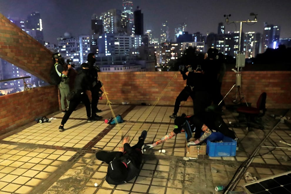 數名示威者站在香港理工大學的建築頂樓,用自製的投石機與鎮暴警察發生衝突。