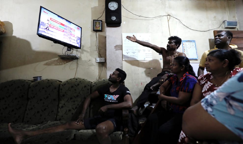 斯里蘭卡人民陣線(Sri Lanka Podujana Peramuna, SLPP)總統候選人拉賈帕克薩(Gotabaya Rajapaksa)的支持者坐在電視前,密切關注著總統大選的進度。