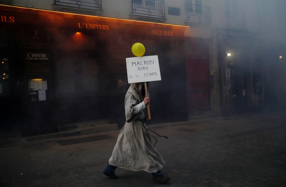 一名男子打扮成僧侶的模樣,拿著牌子走上南特(Nantes)街頭,參與了「黃背心運動」屆滿一周年的紀念活動。