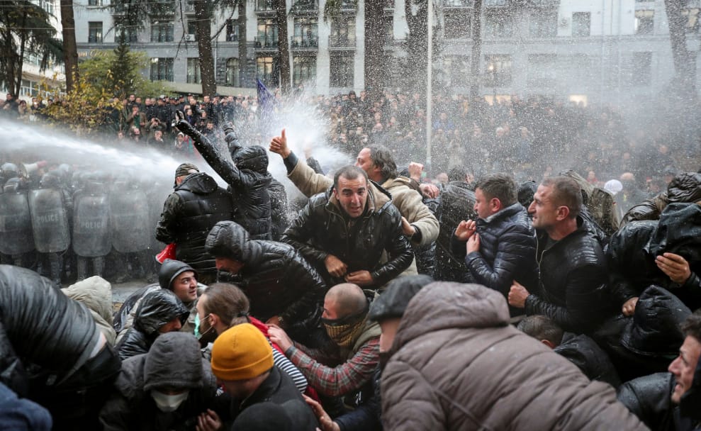 不滿的民眾聚集在國會大樓外,希望喬治亞政府可以提前舉辦大選,卻遭到鎮暴警察以水柱驅離。
