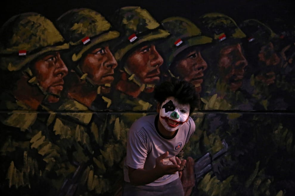 一名示威者在一幅畫有軍人的壁畫前接受拍照,他準備去參加反政府活動。