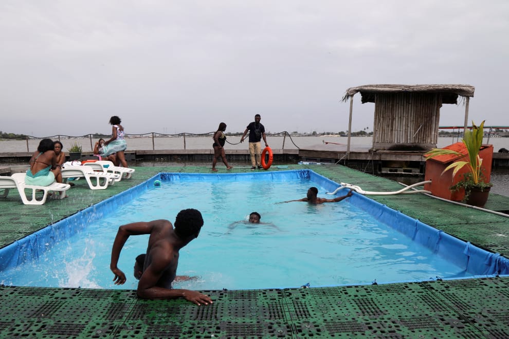 人們在架設於埃布里耶潟湖(Ebrie Lagoon)的人造島上玩耍,這座人造島全部是用保特瓶、資源回收的垃圾蓋起。