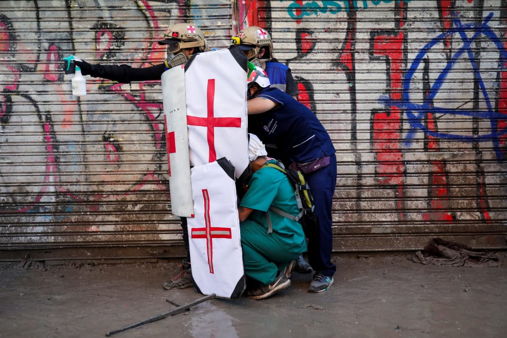 醫療志工立起白底紅十字的盾牌,在首都聖地牙哥(Santiago)的示威現場奔走,希望可以及時協助受傷的示威者。