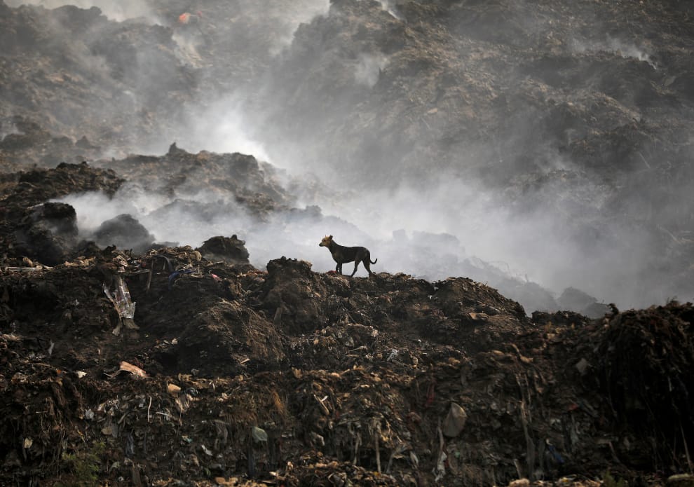 在艾哈邁達巴德(Ahmedabad)郊外,一隻流浪狗行走在焚燒完的垃圾山之間。