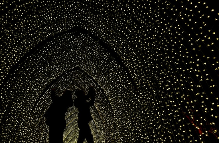 遊客們來到英國皇家植物園邱園(Kew Gardens),流連在繽紛的聖誕燈光造景裡頭。