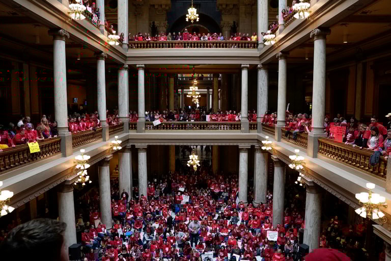 在印地安納州議會大廈,萬名罷工老師聚集此處抗議,呼籲當局正式教師低薪以及公共教育體制不受重視的問題。