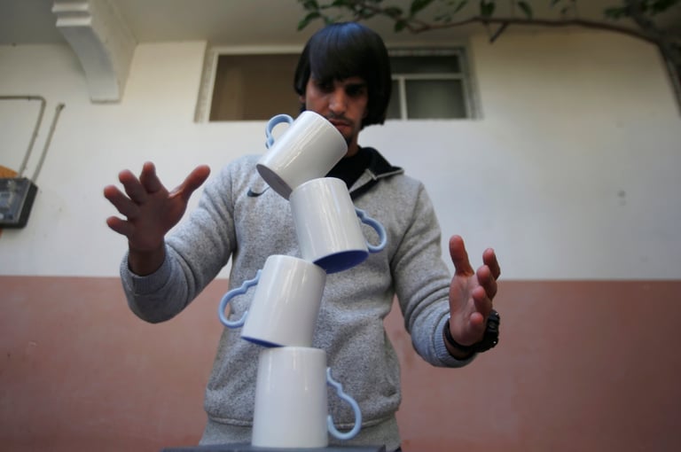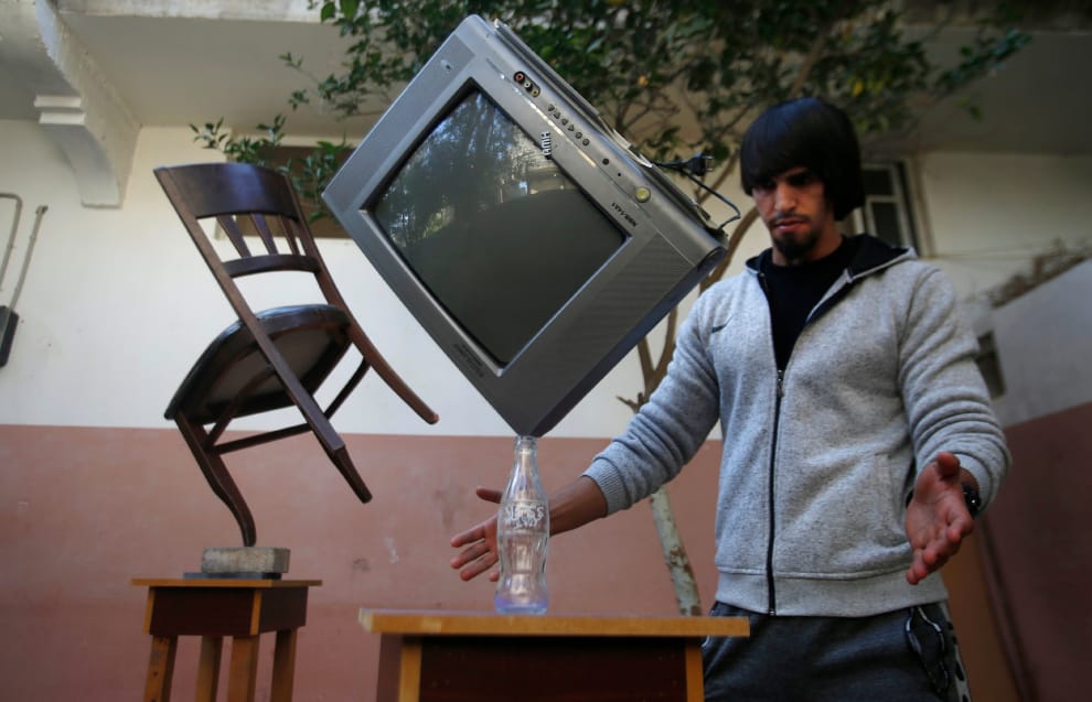在接受《美聯社》訪問時,今年 24歲的塞巴理(Mohammed al-Shenbari)說自己幾乎可以把所有東西疊起來。如此特別的才藝也讓塞巴理在加薩走廊這個衝突地帶小有名氣,他還會到許多心理支持的場合表演給心靈受創的人們觀賞。
