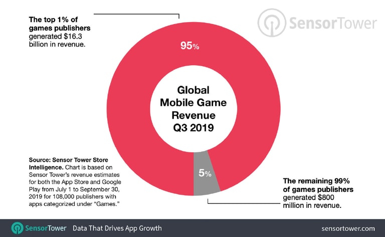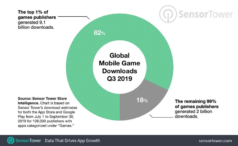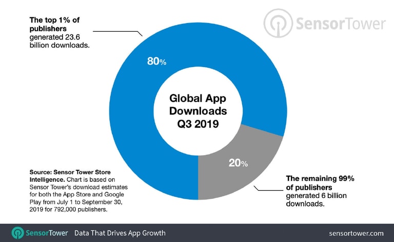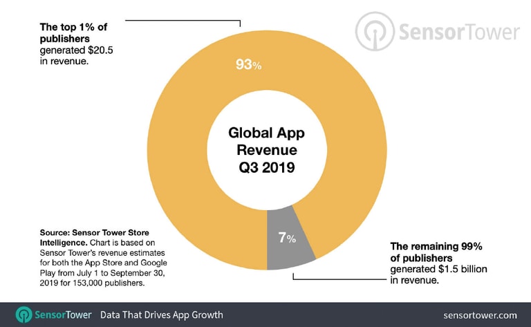 在應用程式的市場上貧富差距十分嚴重,2019 年第三季 App 下載次數高達 296 億次,但全球最頂尖的前 1% 開發商就斬獲了其中的 80%,而剩下 99% 的開發商只占 20% 的下載量。